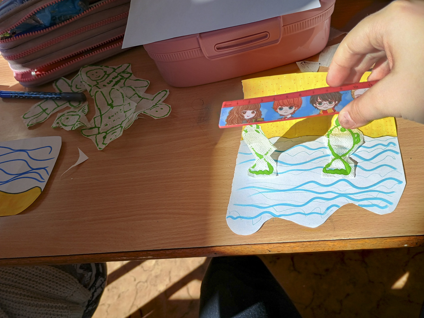 - Panáčka přilepíme za nožičky na papírový podklad tak, aby zbytek postavy mohl volně „vlát“.
