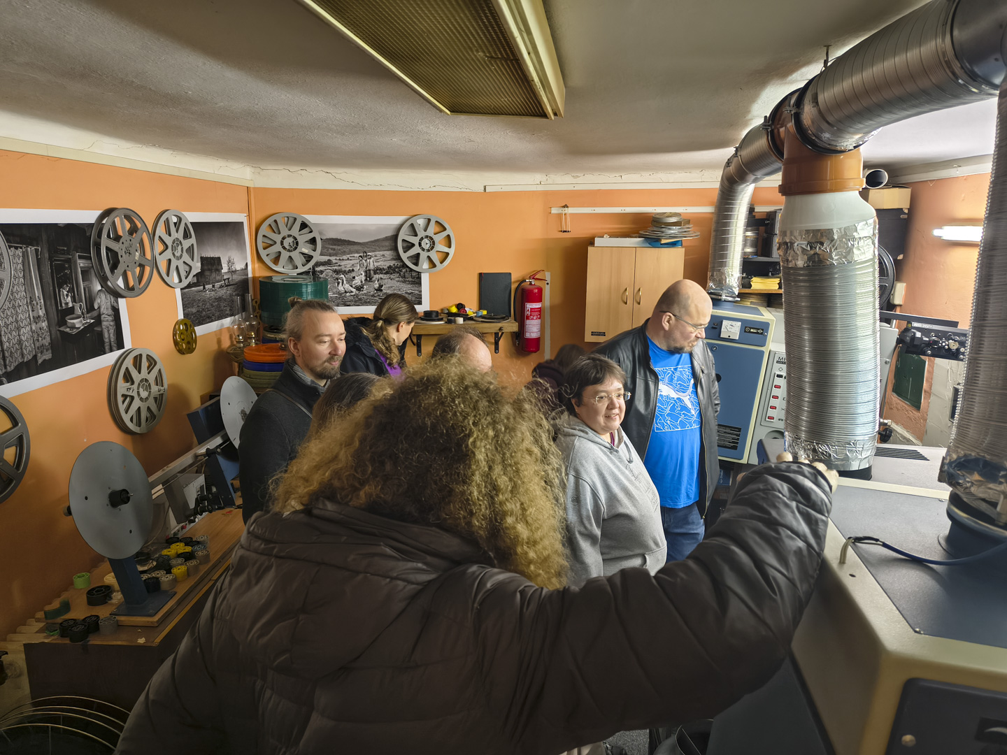 Nejprve jsme se v lednu vydali do Kina Odboj. Většina účastníků dorazila rovnou ze společného brunche – po gastro zážitku tak přišel zážitek kinematografický. Nejstarší opavské kino (z roku 1913) má atmosféru, kterou nelze nainstalovat ani aktualizovat – ta se musí nasbírat. Majitel kina Richard Vacula nás provedl celým objektem, od foyer přes sál až po promítací kabinu. S lehkostí vyprávěl o historii domu i kinematografie – mimo jiné i o tom, že se s Opavou pojí vynález barevného filmu – a zmínil svou sbírku čítající více než tisíc filmových pásů. V promítací kabině jsme stáli u stroje, který připomínal dobu, kdy byl obraz fyzickou hmotou a promítač tak trochu alchymistou. Na závěr nám byl z 35mm pásu promítnut film Sběrné surovosti Juraje Herze. V soustředěném tichu jsme sledovali obraz, který měl pod sebou kus historie.