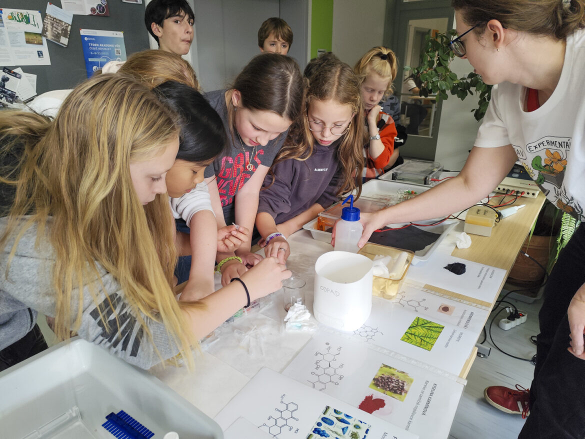 Po obědě jsme se přemístili do experimentálního pracoviště Botanického ústavu, kde si děti vyzkoušely řadu pokusů: genetickou úpravu jablka, výrobu zmrzliny z kapalného dusíku, pozorování barevných spekter, sledování rostlin ve stresu či získávání barviva z jehličí a okvětních lístků. Program byl nabitý, hravý i poučný – děti pochopily, že věda není jen o teorii, ale hlavně o zvídavosti a odvaze zkoušet nové věci.