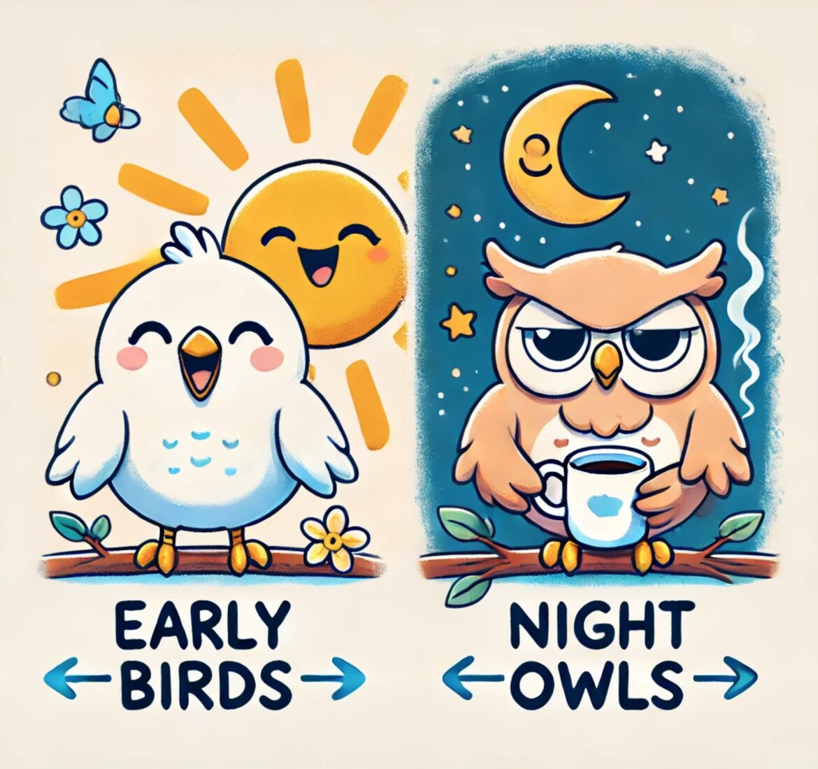 Na světě jsou prý dva druhy lidí: ranní ptáčata (nebo skřivani) a noční sovy. Můj manžel je ranní typ. Patří do skupiny „vstaň a makej“. Vstává s tím nejlepším pocitem: plný elánu a nadšení ze života, ihned po probuzení si užívá zpěv ptáků na stromě za okny ložnice a sám přemírou energie téměř létá. Večer je ale unavený a brzy zralý do postele. Jak se překlopí poledne, začíná postupně vadnout a má problém být vzhůru dlouho do noci.