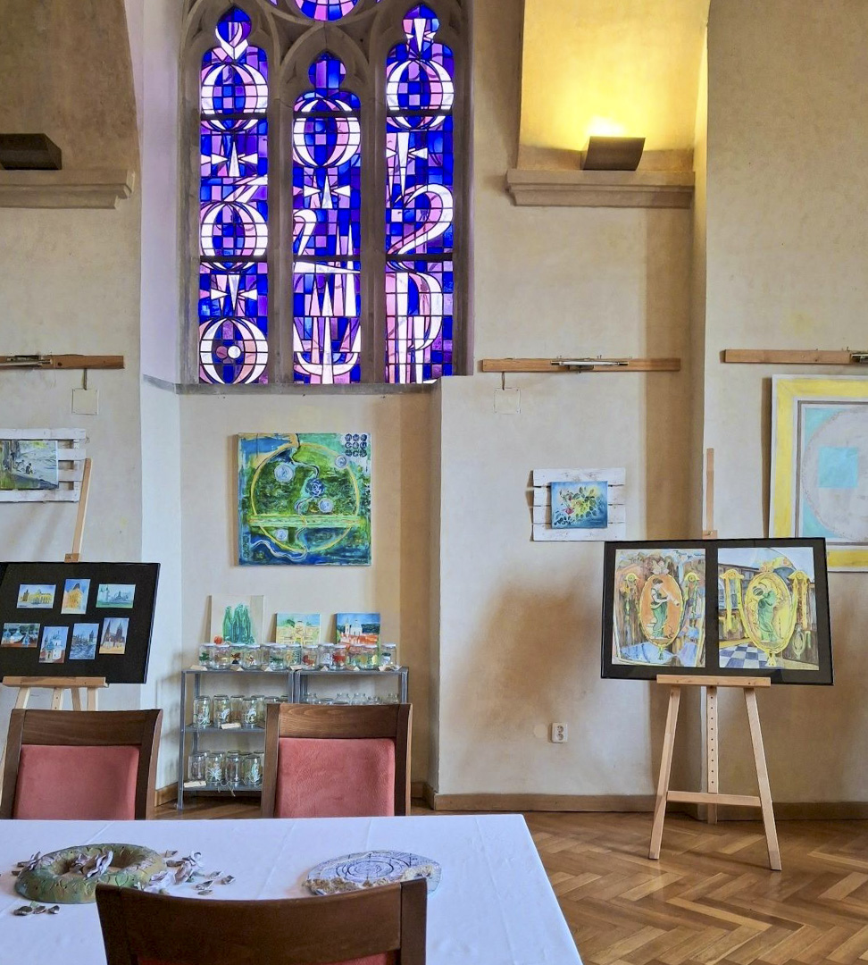Jak už je u malířky zvykem, inspirace přichází z bezprostředního zaujetí známými místy nebo příběhy, například z české historie. Letos k těmto příběhům patří i připomínka osudného náletu v únoru 1945; čtyřlístek „pro štěstí“ je současně fragmentem vitráže, která se dochovala ve zničeném klášterním kostele, a stůl v centru výstavy symbolizuje opuštěné místo, rodinu, která svůj společný oběd nedokončila.