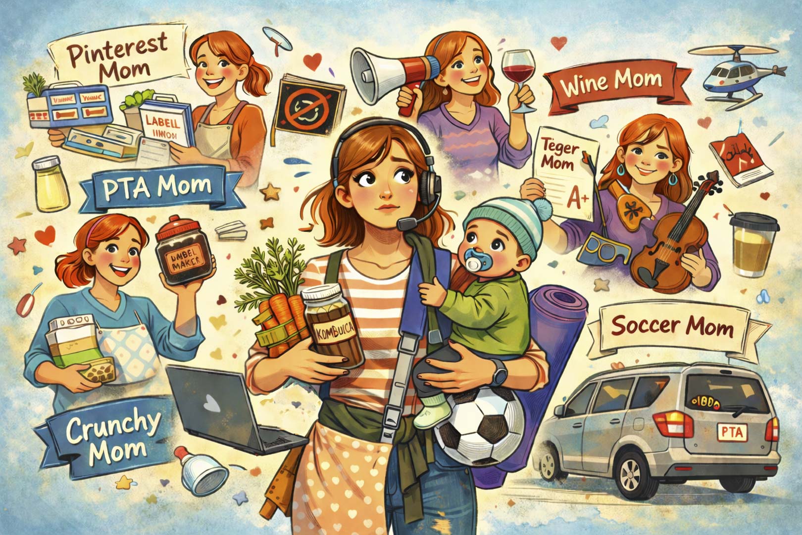 Dále totiž můžete být například „crunchy mom“ (jinak také „granola mom“) a na to se čas navíc hodí. Protože crunchy mom zásadně pěstuje domácí zeleninu bez pesticidů, vlastnoručně peče kváskový chleba a granolu, vyrábí kombuchu a uvažuje, že si pořídí krávu, aby měla pro výrobu domácího kefíru zcela netoxické mléko. Používá jedině látkové pleny z bio bavlny, děti nikdy nepouští k jakékoliv obrazovce, sladkosti jí nesmí přes práh, místo návštěvy lékaře využije bylinky ze zahrádky nebo doporučení svého homeopata, vzdělává děti doma a mezi hodinou matematiky a kroužkem keramiky je nakojí. Jejím opakem pro slabší kusy a working moms pak je „silky mom“, která si život zjednodušuje výdobytky moderní doby, jako jsou papírové pleny, kupované přesnídávky, hračky z plastu, televize nebo epidurální anestezie při porodu. Nerozhodné typy pak mohou volit zlatý střed a být nevyhraněná „scrunchy mom“.