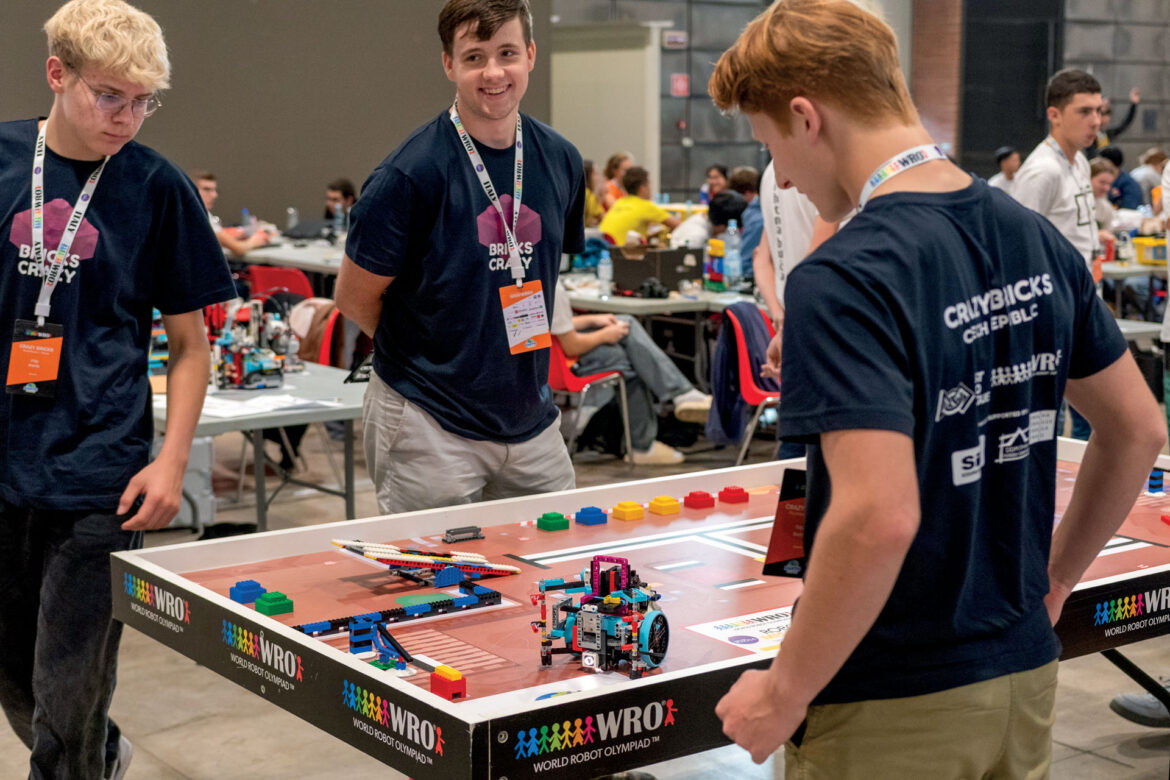 World Robot Olympiad, zkráceně WRO, je Lego robotická soutěž, jejíž finále se letos konalo v italské Brescii. Cílem soutěže je postavit autonomního robota, který by plnil předem zadané mise. Na stavbu se používá stavebnice Lego Mindstorms a Spike. Možná jste se s nimi už někdy mohli setkat. Součástí stavebnice je řada různých motorů a senzorů, které používáme na ovládání robota. Potom je potřeba vytvořit program, aby robot plnil různé mise sám. Mise mohou vypadat třeba tak, že má robot najít barevnou kostku a podle její barvy ji převézt někam jinam.